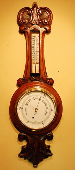 A small 1930s carved oak, aneroid Barometer and Thermometer in very good condition with bevelled glass and polished waxed finish.