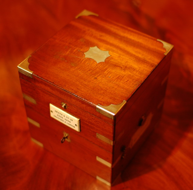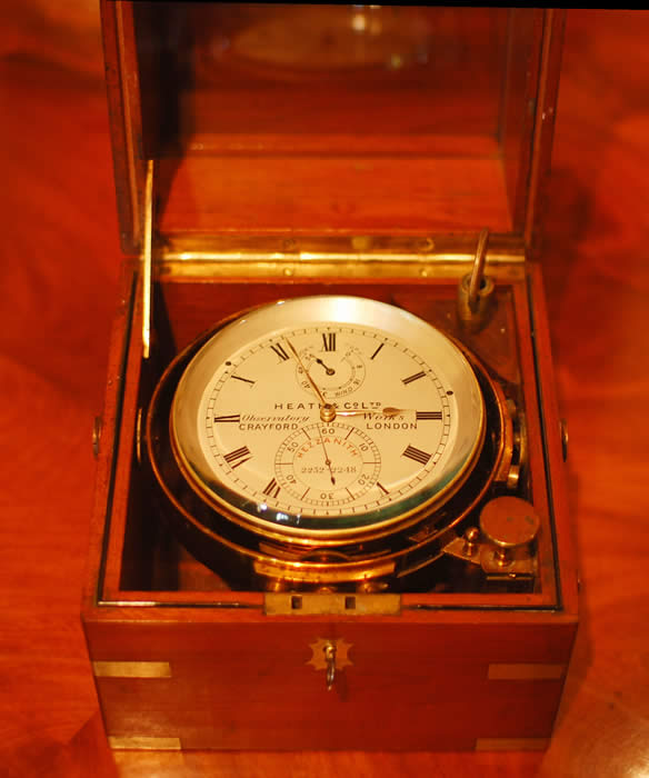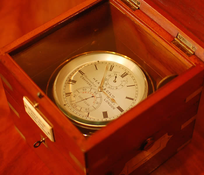A superb cased marine chronometer with mahogany brass bound box with original lid and name plate , a silvered dial with the makers name , Heath & Co , Observatory works ,Crayford, London and numbered 2232-2248 on the dial and on the plate to the case .The dail also has the inscription 'Hezzanith' which was the name given to Heath & Co's Premium range of Nautical instruments and was a guarantee of quality , they also were appointed to the Lords commissioners to the Admiralty .This clock is shown here unrestored and in need of a full movement and case restoration . when the clock is finished and tested we will rephotograph and replace these images
