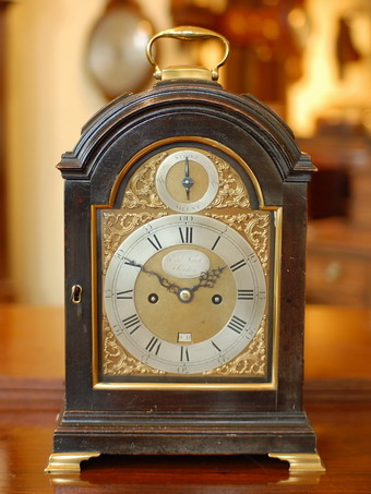 A very original 'triple pad top' Bracket Clock of small proportions with strike-silent to arch. The clock has a fine quality verge escapement (original), 8 day fusee movement which has an engraved back-plate with pendulum and small verge 'bob'. The case is ebonised Pear wood. The full brass dial bears the cartouche of Edward Tutet, London who was made Master of the Clockmakers Company in 1786. This fine clock dates to around 1770. Finding exceptionally original verge escapement clocks is now quite difficult.