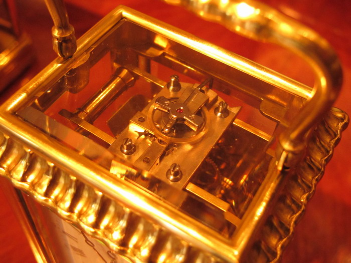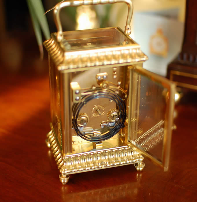 A superb and unusual carriage clock in a cast gorge 'gadrooned' style case with white enamel dial signed by Kleiser of York , Gong striking for the hours   An unusual 'gadrooned pagoda' Gorge shape carriage clock by Kleiser of York . Andrew and Joseph Kleiser of York are listed in 'Watch and clockmakers of the world' Vol2 by B.Loomes as working from 1866-1885 . The movement is completely original and serviced , cleaned and polished and sold with a full 12 month guarantee . We have never sold a carriage clock standing on little turned  feet and have not found any in the Carriage clock refence books ! Bevelled glasses are all in perfect condition . The dial showing Roman numerals with the retailers name and the blued steel Breguet hands . Gong strike .