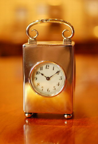 A fine carriage timepiece by well known makers and retailers Goldsmiths and Silversmiths and Co Ltd who were working from 1899 . This clock has the hallmark for 1908 . A classic design with a 'C' scroll folding handle and bun feet . A little larger than average and quite heavy for a small solid silver clock . Sold fully overhauled with a 12 month guarantee .