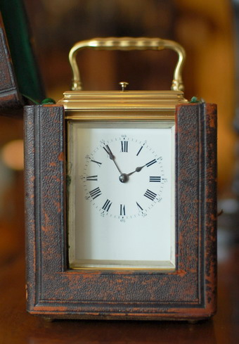 A fine 'Grande Sonnerie' carriage clock in a gilt gorge case with a white enamel dial and bevelled silvered sight ring. This clock has been fully restored, which involved a complete disassembly, 3 stage clean and polish, assembly, test and regulation. The clock is stamped 22495 which could be attributed to Henri Jacot. This fine clock also retains the original large silvered platform and jeweled lever escapement. Grande sonnerie striking, petite sonnerie and fully silent if you wish. The push repeat button to repeat the last hour and quarter. Thick bevelled white glass panels to all sides. A chime selection lever to the base. Circa 1900.