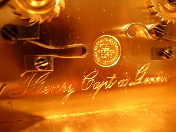 A good early carriage clock by Henry Capt of Geneve who was working circa 1840 . This is a superb example with the original , early lever platform . The clock is engraved on the back plate with the name in script along the base . The large top bevelled glass below the very ornate handle shows the escapement . A fine 8 day movement - bell striking . The case is 'one piece' design with superb hand engraving and gilding of good colour , all bevelled white glass polished inside and out . The dial showing Roman numerals and the makers name below the six with the original 'Trefoil' hands . Please view the large images by clicking through the photos . 12 month RTB GuaranteeA good early carriage clock by Henry Capt of Geneve who was working circa 1840 . This is a superb example with the original , early lever platform . The clock is engraved on the back plate with the name in script along the base . The large top bevelled glass below the very ornate handle shows the escapement . A fine 8 day movement - bell striking . The case is 'one piece' design with superb hand engraving and gilding of good colour , all bevelled white glass polished inside and out . The dial showing Roman numerals and the makers name below the six with the original 'Trefoil' hands . Please view the large images by clicking through the photos . 12 month RTB GuaranteeA good early carriage clock by Henry Capt of Geneve who was working circa 1840 . This is a superb example with the original , early lever platform . The clock is engraved on the back plate with the name in script along the base . The large top bevelled glass below the very ornate handle shows the escapement . A fine 8 day movement - bell striking . The case is 'one piece' design with superb hand engraving and gilding of good colour , all bevelled white glass polished inside and out . The dial showing Roman numerals and the makers name below the six with the original 'Trefoil' hands . Please view the large images by clicking through the photos . 12 month RTB Guarantee