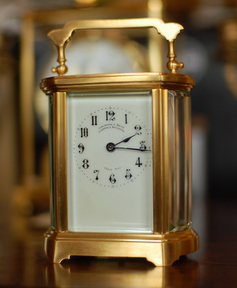 A gilded timepiece carriage clock retailed by Penlington & Batty around 1890. Curved and bevelled side glasses, with an unusual off white enamel dial showing fancy Arabic numerals. Wound once a week with a key. This clock does have a small chip to the right side glass which can be seen in the pictures and a minor chip to the top glass, however only noticeable upon close inspection.