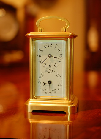 An interesting Carriage clock from Japan . This Seikosha made carriage clock has the addition of day and date on the full enamel dial , with arabic numerals for the main dial . It has an 8 day duration time-piece movement . Seikosha was established in 1892 and this clock would most probably date to around 1900-1910 . The case is gilded and day , date and wind are operated at the rear . Although these early Seikosha clocks are not quite the quality of the French contemporaries , they are now extremely rare !