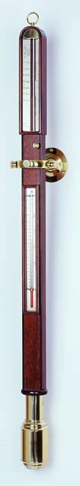 The Ship-of-the-line mercury marine barometer with solid brass gimbal. Mahogany case with black edgeline. Silver-plated dials. Spirit Thermometer and laquered brass fittings. circa 1840