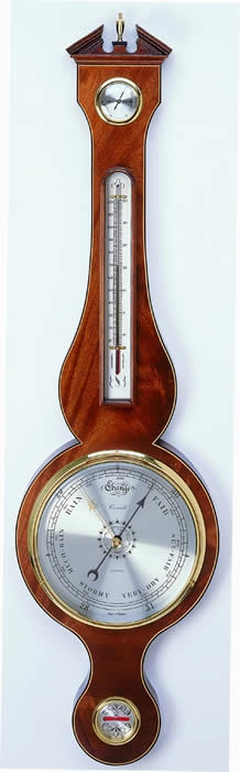 Regency style case with broken arch pediment. Mahogany with curl veneer and white / back edge line. Fitted with hygometer, Thermometer and level. circa 1830
