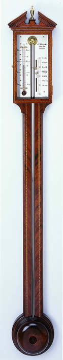 A Mahogany case with feathered veneer and inlaid with 'rope' edgeline. Silver plated dial with vernier and C & F Thermometer. A glazed door and laquered brass fittings. circa 1810.