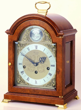 A Burr Walnut cased mantel clock in the classic 1780's Break arch style with carry handle to the top, full brass dial with silvered chapter ring Cherub Spandrels and fine milled hands, polished triple chime movement with a Swiss 9 jewel platform escapement, automatic night silencer and chime sequence correction.Bevelled Glasses to all sides.