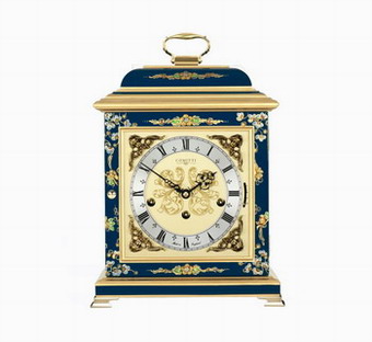 A fine early Georgian style basket top mantel clock with a blue lacquered piano finish cabinet and hand painted gold leaf Chinoiserie artwork, unique and signed by the artist, circa 1705. This exquisite timepiece has a polished triple chime 8 day movement which plays Westminster, Whittington, and St. Michael melodies, along with 9 jewel platform and chime silencer, as well as automatic night silencer (10.00 PM - 7.15 AM) and chime sequence correction. Complete with solid brass dial and cherub spandrels, silver finish chapter ring, fine milled hands, bevelled glass and lacquered solid brass furniture.