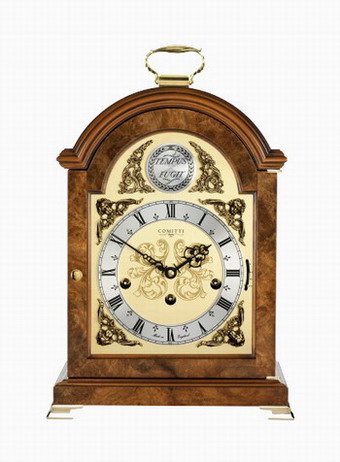 A fine break arch Georgian period mantel clock with a hand polished walnut cabinet with burr veneers, circa 1780. This superb example has a polished 8 day triple chime movement with 9 jewel platform escapement which plays either Westminster, Whittington or St. Michael melodies on rods, and comes with chime silencer, automatic night silencer (10.00 PM - 7.15 AM) and chime sequence correction. Decorated with a solid brass dial and cherub spandrels, a silver finish chapter ring and fine milled hands, as well as bevelled glass and lacquered solid brass furniture.