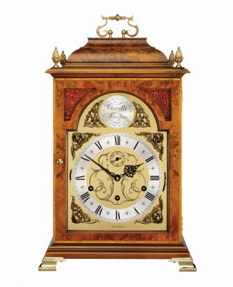 A superb Georgian style bell top table clock with a hand painted burr walnut bell top cabinet with fine fretwork and inlaid satinwood inlay, circa 1730. This fine timepiece comes with a polished 9 bell triple chime 8 day movement with 11 jewel platform escapement which plays Westminster, Whittington, and St. Michael melodies on bells, complete with chime silencer, automatic night silencer (10.00 PM - 7.15 AM), and chime sequence correction. Decorated with a solid brass dial plate and cast gold plated cherub spandrels, a silver finish chapter ring and fine milled hands, as well as bevelled glass and gold plated solid brass furniture.