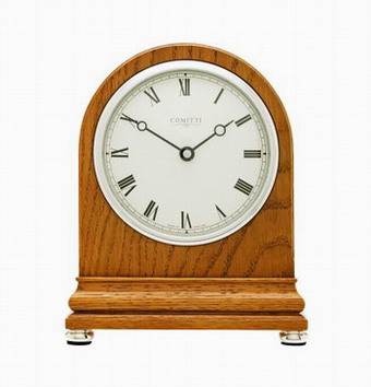 A fine Regency style arch top clock with a hand polished oak case. This timepiece has a highly precise radio controlled quartz movement, as well as an enamel finish dial and delicate period hands, convex glass, and lacquered solid brass furniture.
