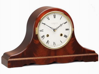 A classic Napoleon style clock with a hand polished mahogany case and book-matched curl veneer. This fine example comes with an eight day bell strike movement which strikes both the hour and half hour. As well as an enamel finish dial and delicate period hands, this clock is decorated with convex glass and lacquered solid brass furniture.