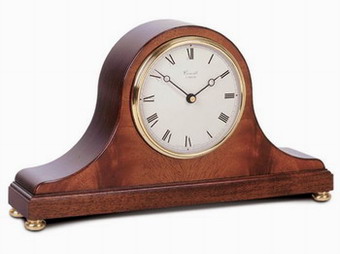 A classic Napoleon style clock with a hand polished mahogany case and book-matched curl veneer. This superb example comes with a highly precise radio controlled quartz movement, As well as an enamel finish dial and delicate period hands, convex glass, and lacquered solid brass furniture.