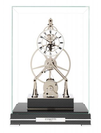The Mayfair is based on a timepiece originally made in France, an elegant design popularly referred to as the 'Great Wheel'. During the Victorian period these skeleton clocks became very fashionable, particularly due to their prominence at the Great Exhibition in 1851. The simplicity of the movement is achieved by omitting a wheel and making compensating changes to the gear train. This handmade fusee movement is a stunning contemporary version of the Mayfair with the rhodium plated movement mounted onto a gloss lacquered carbon fibre base.