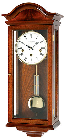 Solid mahogany case with curl veneer to the pediment. It has an Eight day chime movement with silencer with automatic chime sequence correction and a Gridiron style pendulum. It also has an Enamel finish dial and period hands, with mineral glass and lacquered solid brass furniture, a secret key compartment and Westminster melody on rods.