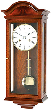 Solid mahogany case with curl veneer to the pediment. It has an Eight day chime movement with a Gridiron style pendulum. It also has an Enamel finish dial with period hands and a secret key compartment. It strikes the time on the hour and the passing of the half hour. Strike on Bell.