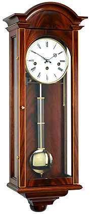 A Georgian style Break arch Mahogany wall Regulator with Westminster chimes, 8 day duration movement, gridiron pendulum and an enamel finish dial showing Roman numerals.The case is inlaid with Boxwood and has superb curl veneers on solid mahogany. This clock also features 'night off' for the chimes