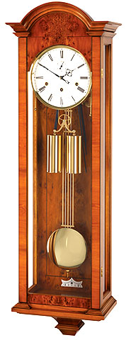 Break arch antique yew finish case with book-matched burr yew veneers. The door features cross-banded figured yew with inlaid black stringing. Hand rubbed waxed finish. It has an eight day weight driven chime movement with silencer and an automatic night silencer (10.00 PM to 7.15 AM) and chime sequence correction with a Gridiron style pendulum. Also included with an enamel finish dial with seconds indication and period hands, bevelled glass and lacquered solid brass furniture, a Secret key compartment and Westminster melody on rods.