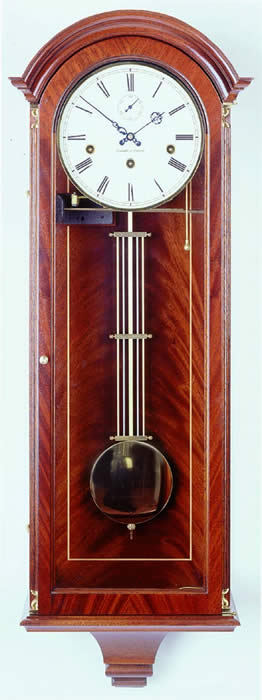 A Break arch Mahogany wall Regulator with Westminster,Whittington and St Micheals chimes, the 8 day duration movement, gridiron pendulum and enamel finish dial showing Roman numerals.The case is inlaid with Boxwood and has superb curl veneers on solid mahogany. This clock features a seconds beat pendulum and 'night off' for the chimes