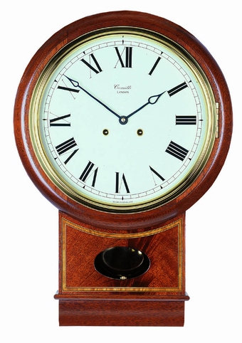 Traditional Drop Dial case in Mahogany. Curl veneer with satinwood crossbanding with Lenticle to see the swing of the pendulum, 8 day, bell striking movement.