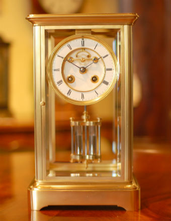 A superb French four glass regulator clock by Samuel Marti of Paris . This fine and substantial clock strikes the hours and the half hours on a bell. A two piece enamel dial showing Roman numerals and with the center of the dial showing the jeweled 'deadbeat' escapement . Bevelled glass all round and a large sealed mercury compensating pendulum. A fine French 8 day movement and polished blued steel 'Breguet' Hands. The movement is stamped and numbered with the S.Marti circular stamp . This example is typical of high quality French clock making of the 1870-80s and has a fine 'satin' gilt case with very thick bevelled glass . Please note , this is not a clock that can be shipped due to a mercury filled pendulum . Sold with a full 12 month R.T.B Guarantee . Click image to see more photos .