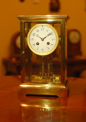 A superb Mantel clock in polished Brass and cut Bevelled glass with sealed Mercury Pendulum. Striking on a gong for the hours and half hours. Key wound once a week.