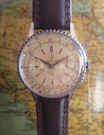 A superb Chronograph by Breitling of Switzerland. The dial on this watch has a great patination and is the original - untouched not restored. The bezel rotates the slide rule to measure distance. The Breilting Venus 175 movement has 17jewels, center sweep hand offset seconds and minute counter. Chamfered hour batons and chamfered hands - the original 'dagger' style. 36.5mm diameter without crown.